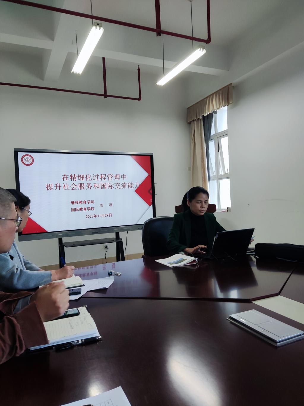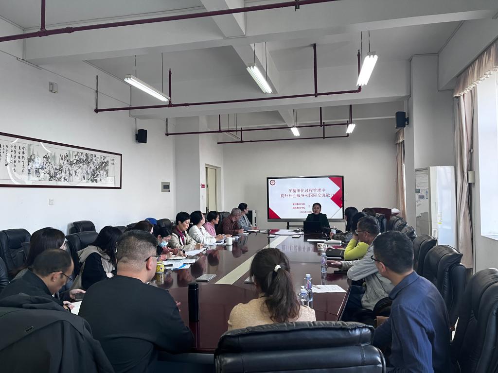为深入开展学习贯彻习近平新时代中国特色社会主义思想主题教育,推动党建引领基层管理工作,11月29日下午,我院党总支副书记兰浈以“在精细化过程管理中提升社会服务和国际交流能力”为题,为我院全体教职工上了一节生动的党课。