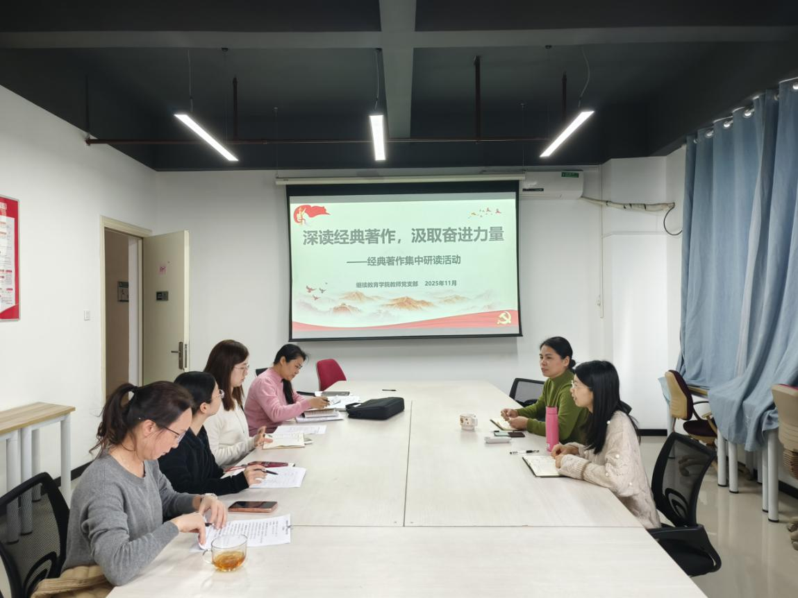 为深入学习贯彻习近平新时代中国特色社会主义思想,引导全体党员从党的经典著作中汲取思想伟力和精神滋养,不断提升运用党的科学理论武装头脑、指导实践、推动工作的能力,11月26日,继续教育学院教师党支部开展经典著作集中研读活动,支部全体党员参加。