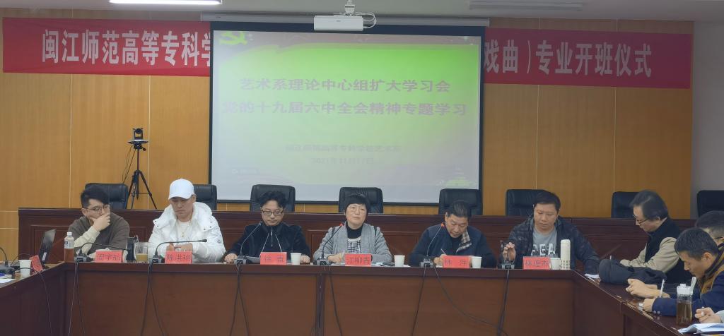 2021年11月17日下午,艺术系(福州市艺术学校)在甘蔗校区行政楼五楼大会议室召开理论中心组扩大学习会专题学习党的十九届六中全会精神。会议由艺术系党总支书记江柳青主持,艺术系(福州市艺术学校)全体教职工参加。