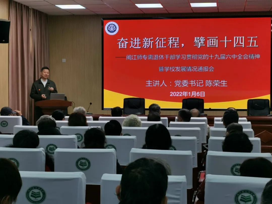 陈荣生代表学校党委向老干部们宣传贯彻党的十九届六中全会精神,并对学校“十三五”期间教育建设发展情况作了全面通报,对办学综合实力、办学条件、办学规模、办学格局、专业建设、科学研究、师资队伍、社会服务、对外交流九个方面的重点工作详细的介绍。同时结合学校的“十四五”规划,对办学目标、校区规划、内涵建设等情况进行介绍。他代表学校党委、行政感谢老同志们为学校建设各项事业的发展、为关心下一代工作做出的积极贡献,希望老同志们继续关心学校,为学校建设发展中的难点建言献策,为福州教育高质量发展继续发挥作用。