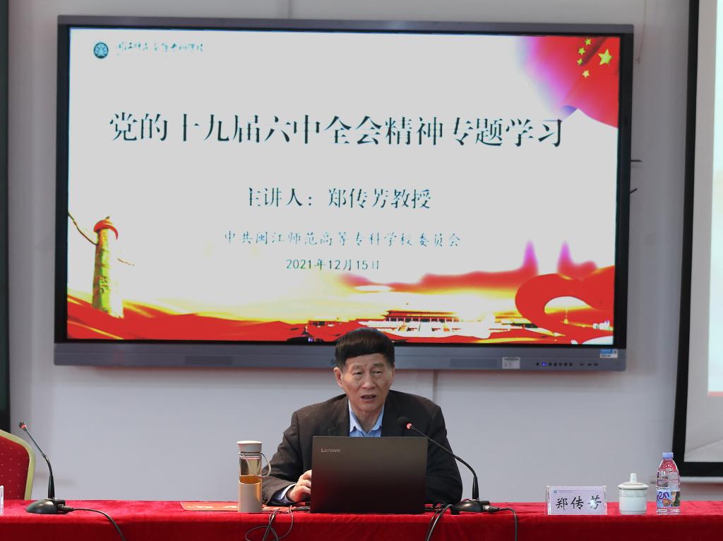 12月15日,闽江师专召开校党委理论学习中心组(扩大)学习会暨学习贯彻党的十九届六中全会精神专题辅导讲座,党史学习教育省委第一巡回指导组组长、省委宣讲团专家郑传芳教授作辅导报告,校党委书记陈荣生主持。
