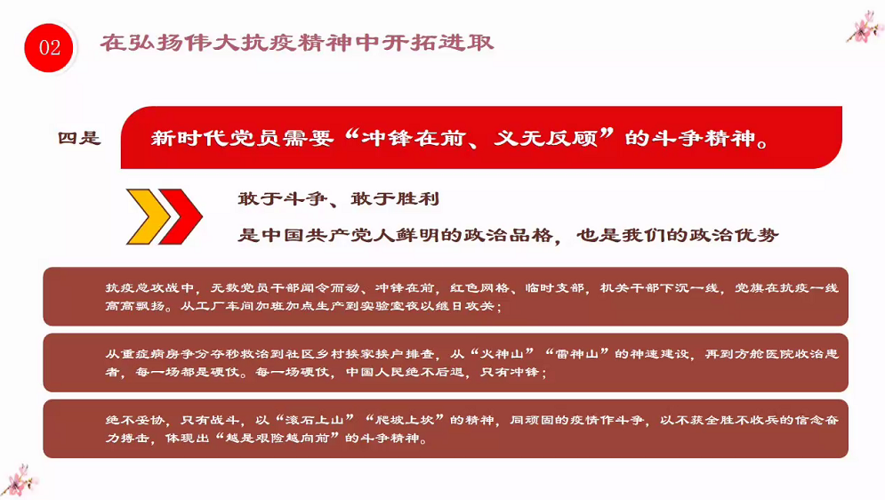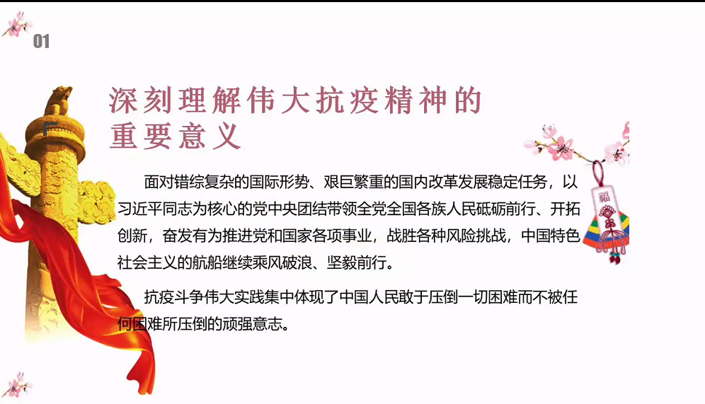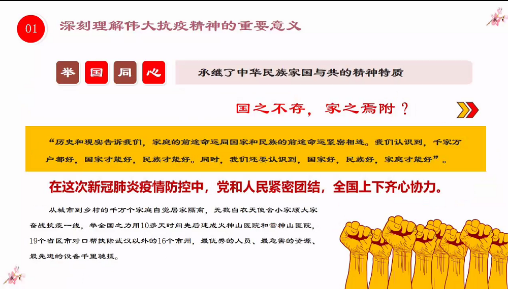 本次党课分为两个部分,一是理解伟大抗疫精神的重要意义,二是在弘扬伟大抗疫精神中开拓进取。张瑛描述了新型冠状病毒对我们的生活的影响,也讲述了中国人民用中国力量有效筑牢了遏制疫情蔓延的防线,用中国速度为世界各国贡献了防控疫情的宝贵经验,抗疫斗争伟大实践集中体现了中国人民“和而不同、和合统一、百姓昭明、协和万邦天下为公、天下大同”的人文主义情怀,讲信重情、和衷共济、爱好和平的大国道义担当,展现了生命至上、举国同心、舍生忘死、尊重科学、命运与共的伟大抗疫精神。张瑛表示,作为新时代的党员需要“逆向而行、甘于献身”的英雄精神,需要“勇于担当、不计得失”的使命精神,需要“同舟共济、守望相助”的团结精神,需要“冲锋在前、义无反顾”的斗争精神。她号召全体成员在弘扬伟大抗疫精神中开拓进取,尤其是在福建省发现疫情的情况下,弘扬精神,勇担使命,为人民服务。