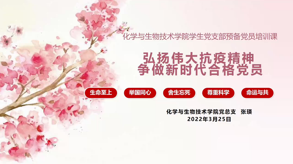 3月25日晚,化学与生物技术学院学生党支部在QQ群开展党课,主题为:“弘扬伟大抗疫精神,争做新时代合格党员”,由党总支副书记张瑛同志主讲,化学与生物技术学院学生党支部全体成员参加了党课学习。