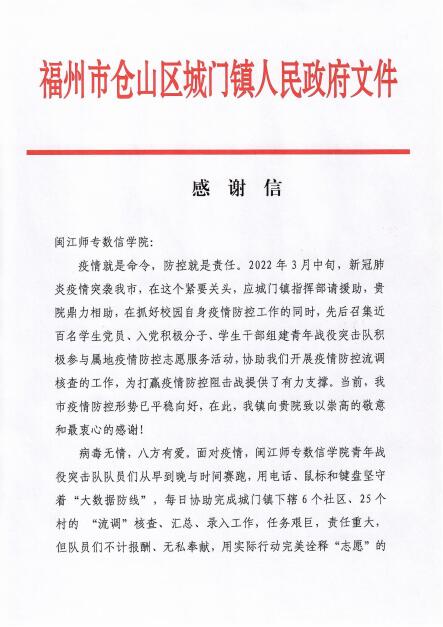 “五四”青年节前夕,我校收到仓山区城门镇疫情防控指挥部发来的感谢信,信中对我校数信学院组建青年疫情战役突击队协助属地开展流调核查工作表示感谢,并给予高度评价。