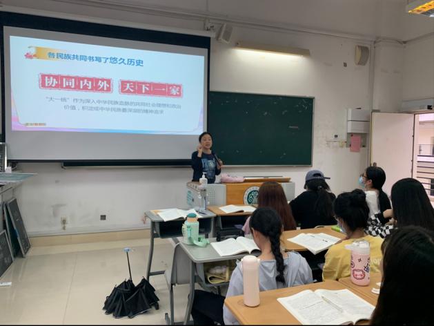 为了深入贯彻《中共中央国务院关于加强和改进新形势下高校思想政治工作的意见》文件精神,落实党员领导干部上讲台,发挥思政课堂立德树人根本任务,提高思政课教学效果,4月27日下午,学前教育学院院长林毓君为20学前教育2班学生讲授题为《铸牢中华民族共同体意识共同绘就中华民族伟大复兴壮美画卷》的形势与政策课。