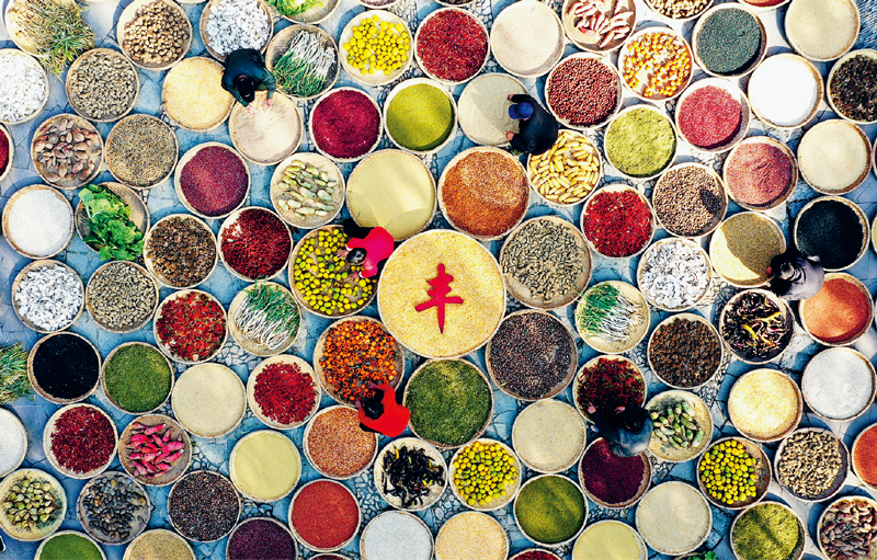 深秋时节,地处沂蒙老区的山东省临沂市沂南县铜井镇竹泉村,在村里举办一年一度的“晒秋”活动。村民把收获的农作物摆在地上或挂在墙上,晒出丰收画卷。“晒秋”已成为竹泉村一张独具特色的旅游名片,吸引众多游客前来观赏。图为2021年11月13日,竹泉村村民在展示晾晒农作物(无人机照片)。 新华社记者 范长国/摄