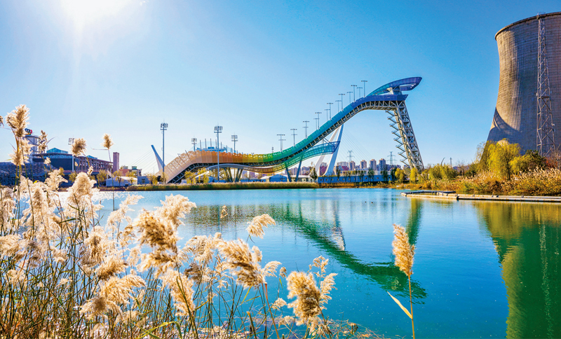 首钢滑雪大跳台位于首钢园区内,从远处看宛如一只“水晶鞋”,因设计灵感源于敦煌壁画中的“飞天”,又名“雪飞天”,与“冰丝带”、“雪如意”等冬奥场馆一样,突出中国元素,彰显文化自信。图为2021年11月11日拍摄的首钢滑雪大跳台。 《北京日报》记者 潘之望/摄