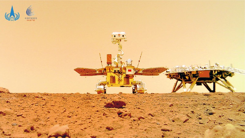 2021年6月11日,国家航天局在北京举行天问一号探测器着陆火星首批科学影像图揭幕仪式,公布了由“祝融号”火星车拍摄的着陆点全景、火星地形地貌、“中国印迹”和“着巡合影”等影像图。首批科学影像图的发布,标志着我国首次火星探测任务取得圆满成功。图为“着巡合影”,是火星车释放安装在车底部的分离相机后退至着陆平台附近,由分离相机拍摄的火星车与着陆平台的合影。 新华社发(国家航天局供图)