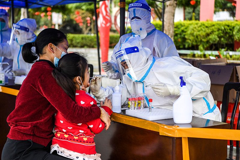 2022年2月16日,在广西百色市德保县,医务人员在做核酸采样。