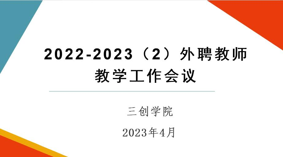 为提升外聘教师教学综合能力,规范教学基本要求,三创学院于2023年4月3日晚依托腾讯会议平台召开了2022-2023学年第二学期外聘教师专场线上教学工作会议。三创学院副院长黄昌兴、教研室主任王宏以及全体外聘教师参加了此次会议。