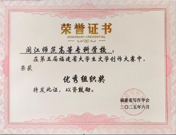 近日,第五届福建省大学生文学创作大赛结果揭晓。我校通识教育学院语文教研室组织选送的作品荣获一等奖2项,二等奖2项,三等奖1项,优秀奖2项,我校荣获优秀组织奖。