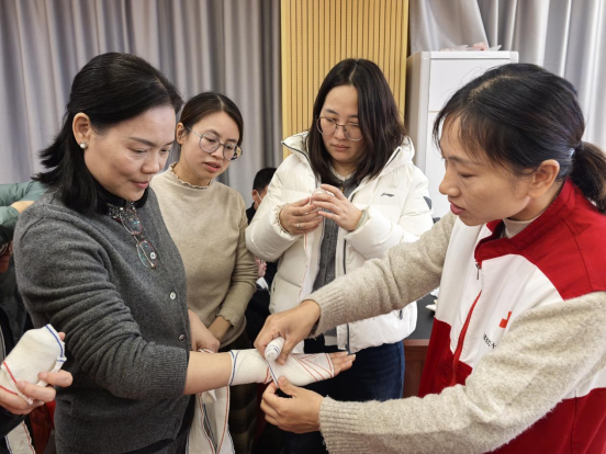 本次培训分为线上学习和线下实操两个阶段。参训学员首先通过“人人急救”APP在线学习了应急救护基本理论,完成线上课程并考核合格后,于1月9日下午在附小506报告厅及515生命教育中心教室集中开展线下实操培训及考核。在线下培训中,福建省红十字应急救护培训中心讲师重点讲解了创伤包扎技巧和心肺复苏(CPR)操作规范,并指导学员逐一进行实操演练。