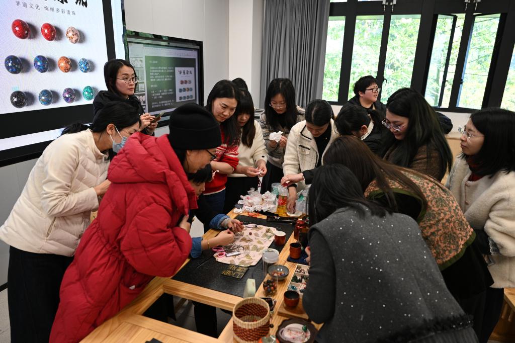 在实践体验环节,女教职工们在老师的指导下,手持素面漆珠,从粗砂纸到细砂纸,一遍遍耐心打磨。随着砂纸目数的不断增加,原本朴拙的漆珠逐渐显露出温润的光泽和精美的纹理。打磨完成后,大家又精心挑选并搭配绳结,将亲手打磨的独一无二的漆珠串成手串。活动现场气氛热烈而温馨,老师们时而凝神专注,时而相互交流,在重复的打磨中感受时间的沉淀,在一穿一引间体会手工的乐趣。