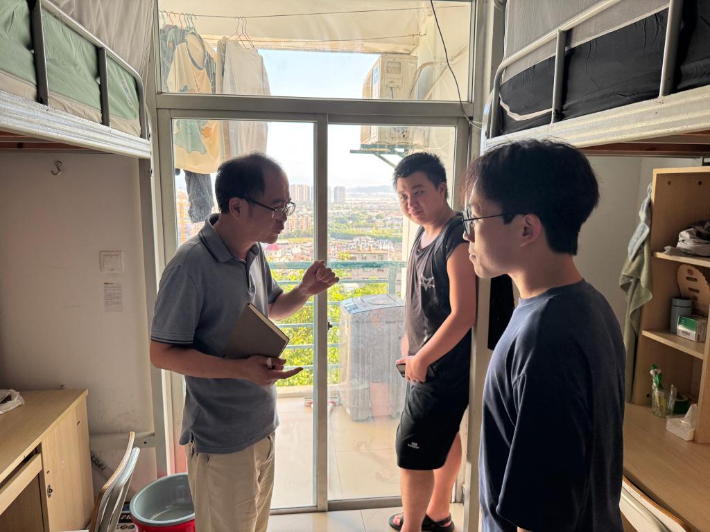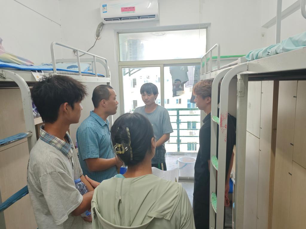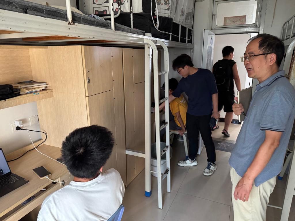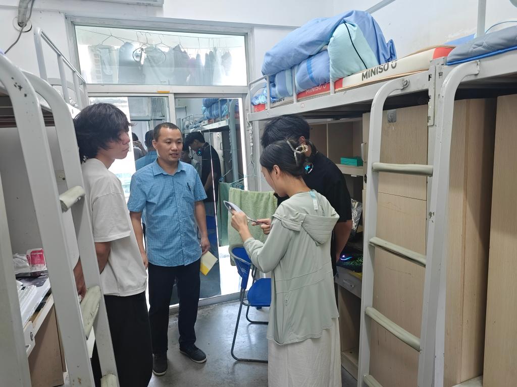走访中,学院领导老师关心同学们的假期安排与思想动态,亲切询问留校和离校学生的具体安排,并围绕宿舍用电安全、财物保管、出行交通等方面进行细致提醒,叮嘱大家切实增强安全防范意识,提升自我保护能力,确保度过一个平安、和谐的国庆中秋假期。同时,鼓励同学们合理安排作息,积极参与锻炼,保持健康的生活习惯。