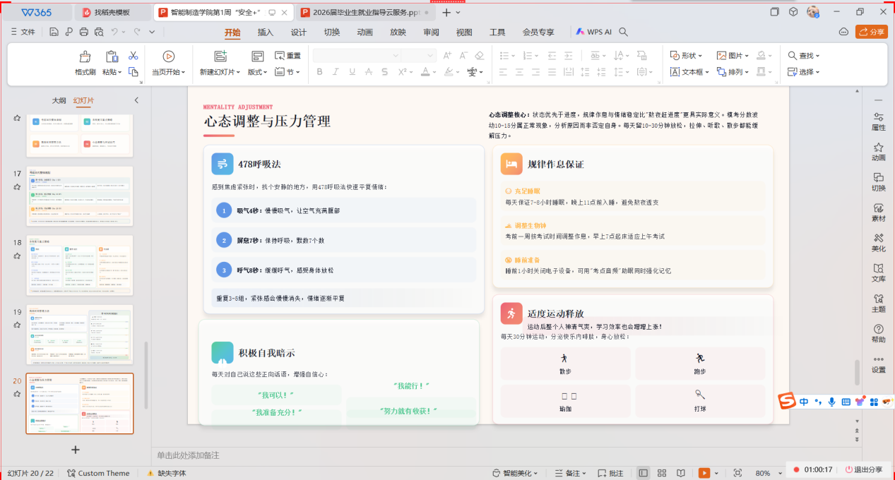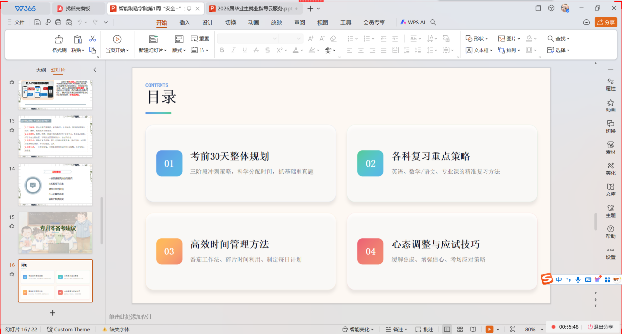 本次指导紧扣考前冲刺核心需求,从整体规划、学科策略、时间管理、心态调整、应试技巧五大方面展开。辅导员明确备考核心原则,强调要打好基础,冲刺阶段应聚焦基础、吃透真题,切勿死磕偏题难题。针对考前焦虑,辅导员引导同学们通过积极自我暗示、适度运动调节心态,理性对待。