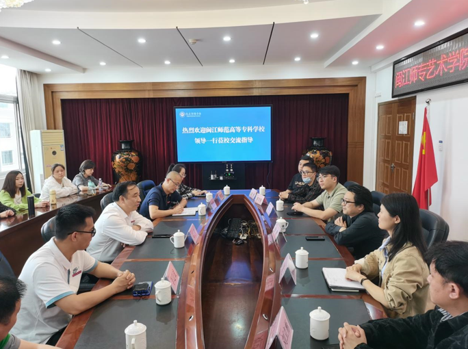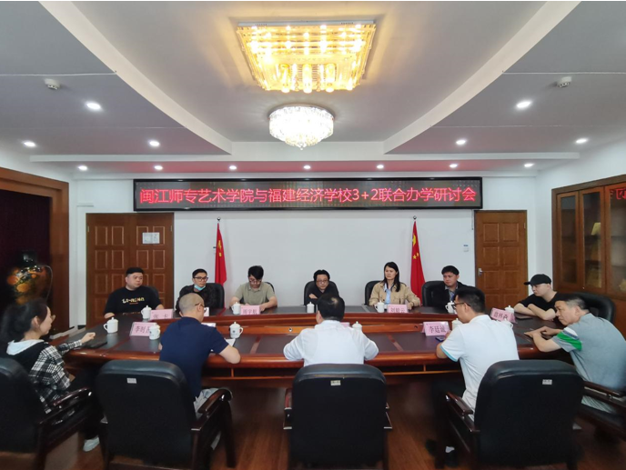 为贯彻落实《国家职业教育改革实施方案》,深入推进“3+2”联合办学工作,促进学院高质量发展,2022年5月27日,闽江文旅演艺职教有限公司董事长、闽江师范高等专科学校艺术学院院长徐青率队前往福建经济学校进行“3+2”联合办学研讨会,院团委书记、学生党支部书记周宇航,表演艺术教研主任刘毅云,美术教研室主任黄朝燊,钢琴与器乐教研室副主任刘立彬及相关各专业教师一同参会。福建经济学校党委书记、校长郑长青携校党委委员、副校长王养生,艺术专业系部主任龚发辉,招生就业办副主任李廷诚及音乐舞蹈教研室、平面设计教研室等各专业教师出席了研讨会。