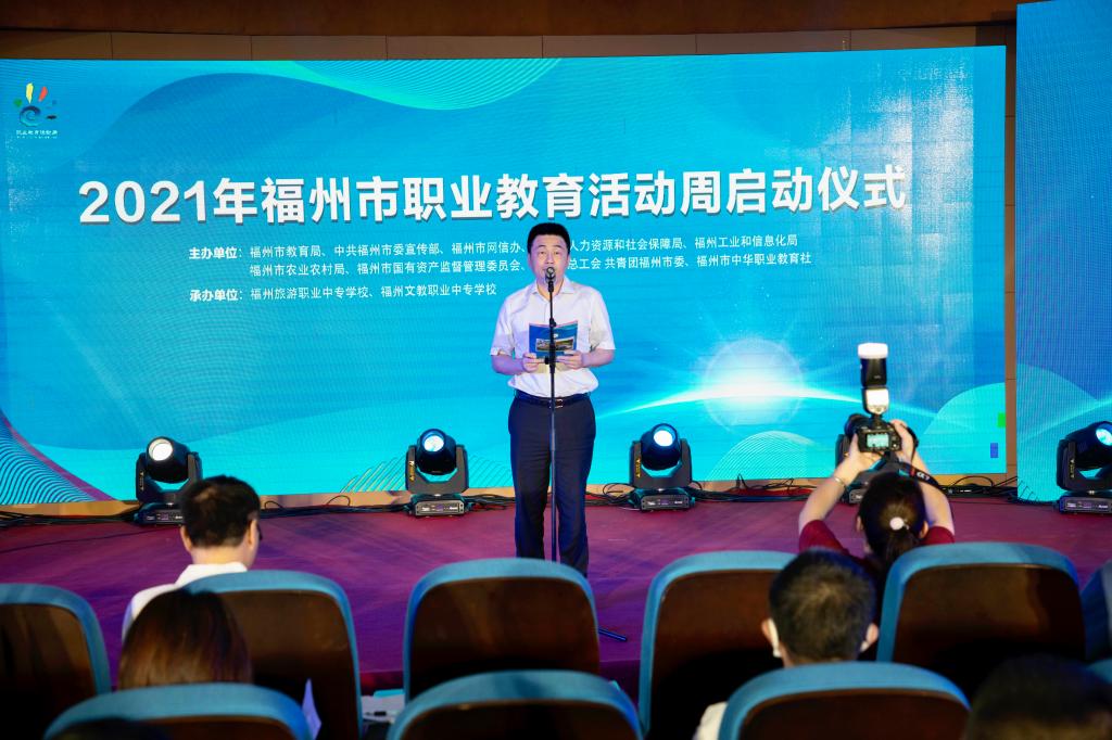 2021年5月21日上午,由福州市教育局、中共福州市委宣传部、福州市网信办、福州市人力资源和社会保障局、福州工业和信息化局、福州市农业农村局、福州市国有资产监督管理委员会、福州市总工会、共青团福州市委、福州市中华职业教育社等联合主办;福州旅游职业中专学校、福州文教职业中专学校联合承办的2021年福州市“职业教育活动周”启动仪式在福州旅游职业中专学校隆重举办。