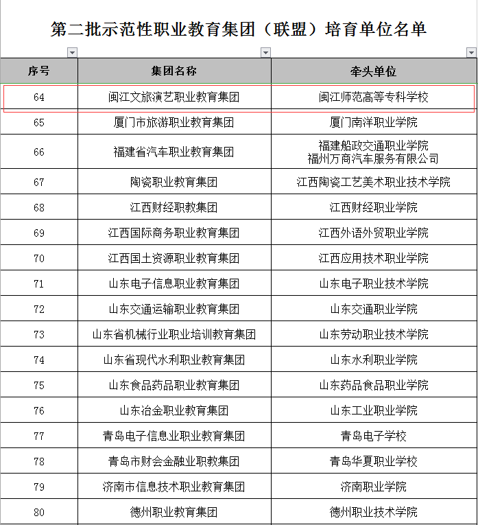 近日,教育部发布了《关于公布第二批示范性职业教育集团(联盟)培育单位名单的通知》,由闽江师范高等专科学校牵头创办的闽江文旅演艺职业教育集团成功入选,成为第二批149个国家示范性职教集团培育单位之一。