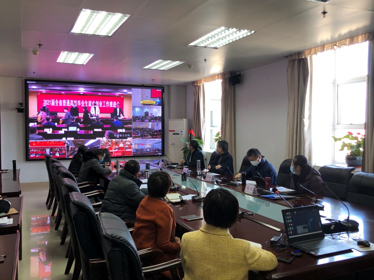 1月15日上午,省教育厅、省人社厅联合召开2021届全省高校毕业生就业创业工作推进会。我校组织收看视频会议,陈荣生书记、林贤校长,副校长黄耀荣、林旻,学生处、教务处、各院系主要负责人,负责就业工作的职能人员以及毕业班辅导员等40余人参加会议。