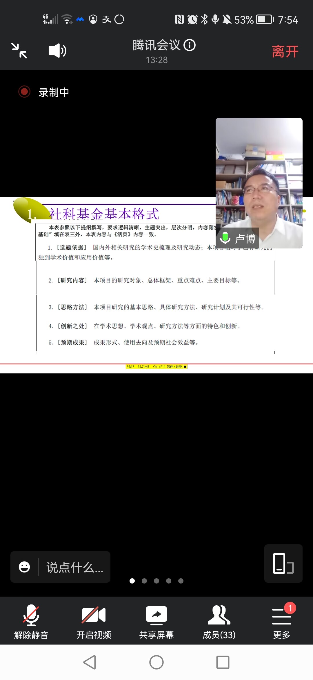 本次讲座中,卢长宝教授围绕社科类课题的基本格式、选题、团队构建、论证框架与研究内容等为我校教职工进行了详细讲解,他指出一份优秀的申报书就像是一个优秀的“故事”,要重点做好文献梳理、选题的凝练,并指导了申报书撰写的各项细节。讲座结束之后,卢教授还针对我校教师的4份社科项目申报书进行了具体的指导,提出要以解决问题为导向,选题要有时代感,突出地方、民族、学科特点。研究要贴近理论前沿,参考文献和资料要准确,尽可能找到一手的资料等。通过卢教授的指导,让各项目申报人受益匪浅。