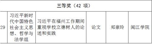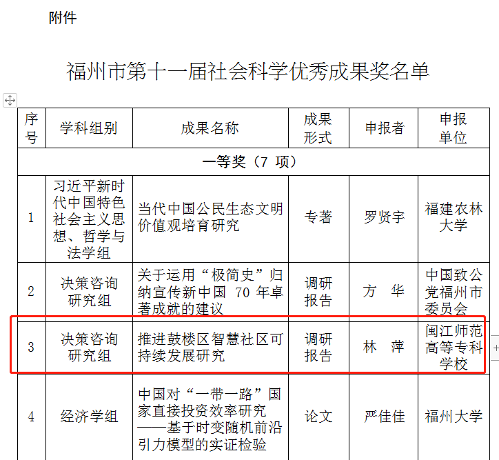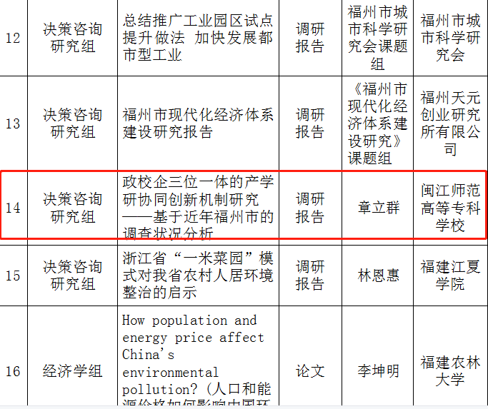 我校有三项成果榜上有名。由马克思主义学院林萍老师撰写的调研报告《推进鼓楼区智慧社区可持续发展研究》获一等奖,科研处章立群老师撰写的论文《政校企三位一体的产学研协同创新机制研究——基于近年福州市的调查状况分析》获二等奖,科研处郭晓莹老师编写的教材《学前儿童家庭与社区教育》获三等奖。