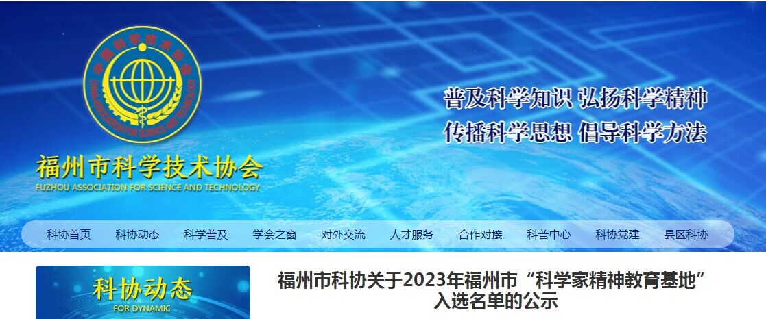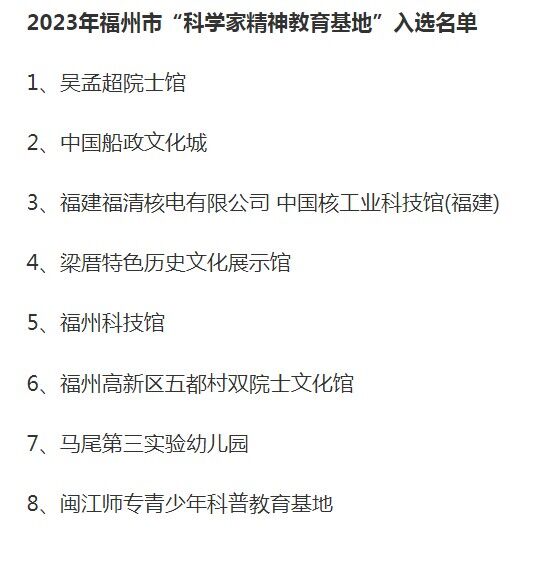 近日,由福州市科学技术协会、福州市教育局、福州市科技局、福州市国资委及福州市委军民融合办联合组织的“2023年福州市科学家精神教育基地”选评工作落下帷幕。经我校科学技术协会申报推荐,隶属于小学教育学院和附属实验小学的青少年科普教育基地与吴孟超院士馆、中国船政文化城、福州市科技馆等基地一同入选“2023年福州市科学家精神教育基地”。