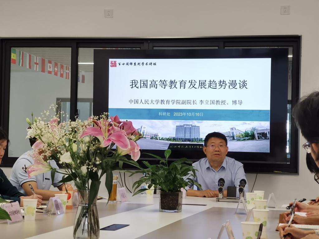 2023年10月16日,中国人民大学教育学院副院长李立国教授应邀来我校,作了题为“高等教育发展趋势漫谈”的讲座。活动由科研处主办。校党委副书记、校长杨建义参加讲座,各学院院长、部分教研室主任及人文社科博士共同参加讲座与交流活动。