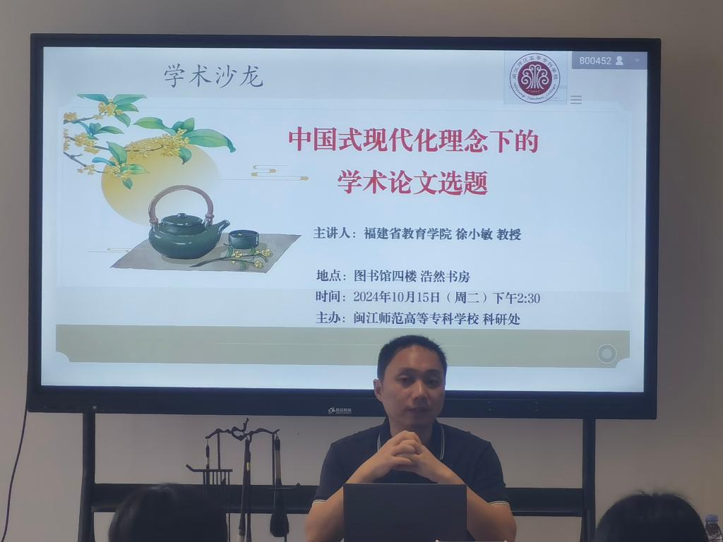 2024年10月15日下午,我校科研大讲坛讲座活动在旗山校区图书馆成功举办。本次活动特邀福建教育学院科研处处长、《福建教育学院学报》社长徐小敏教授担任主讲,就“中国式现代化理念下的学术论文选题”主题进行了深入分享,陈强副校长亦莅临参与了本次学术沙龙。