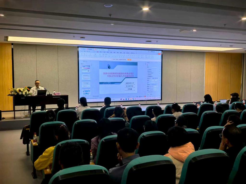 11月5日下午,我校在旗山校区图书馆楼502鉴赏室举办“科研大讲坛”,特邀福建师范大学社会科学处副处长、人文社科平台管理中心副主任(正处级)何瑞鑫老师来校作题为“浅谈对高校教师高级别社科基金项目申报及学术积累的几点思考”的专题讲座。各部门、学院科研骨干,辅导员代表,附属单位教师代表,科研处全体教职工等70余人到场聆听。