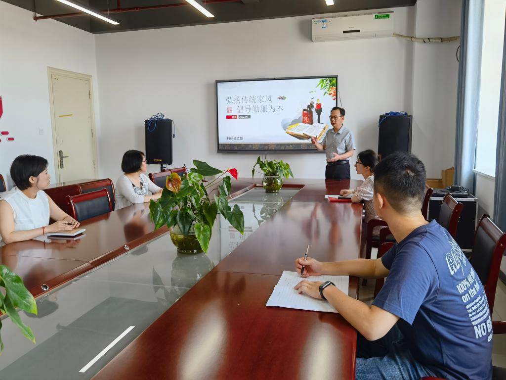 为进一步倡导廉洁文化,树立良好家风,增强党员干部廉洁自律意识,2022年6月27日上午,科研处支部举办“弘扬传统家风,倡导勤廉为本”专题党课。党课由党支部书记陈强主讲,支部全体党员参加专题教育学习。