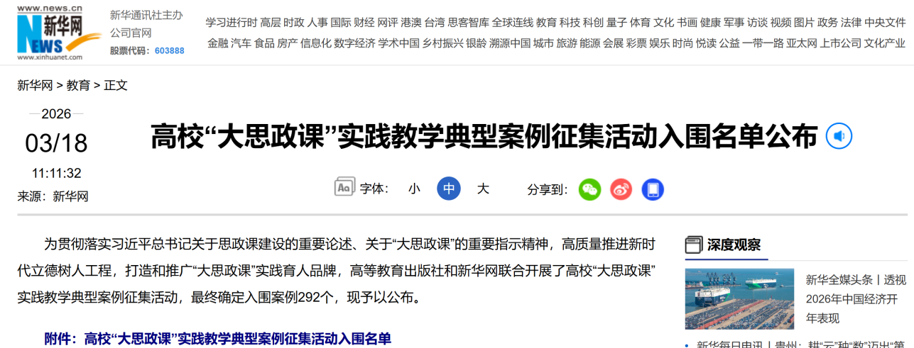 近日,由高等教育出版社与新华网联合主办的高校“大思政课”实践教学典型案例征集活动结果公布,我校报送的《“四维三化”:探索“大思政课”实践育人新模式》从全国高校众多参评案例中脱颖而出,成功入选全国高校“大思政课”实践教学典型案例。