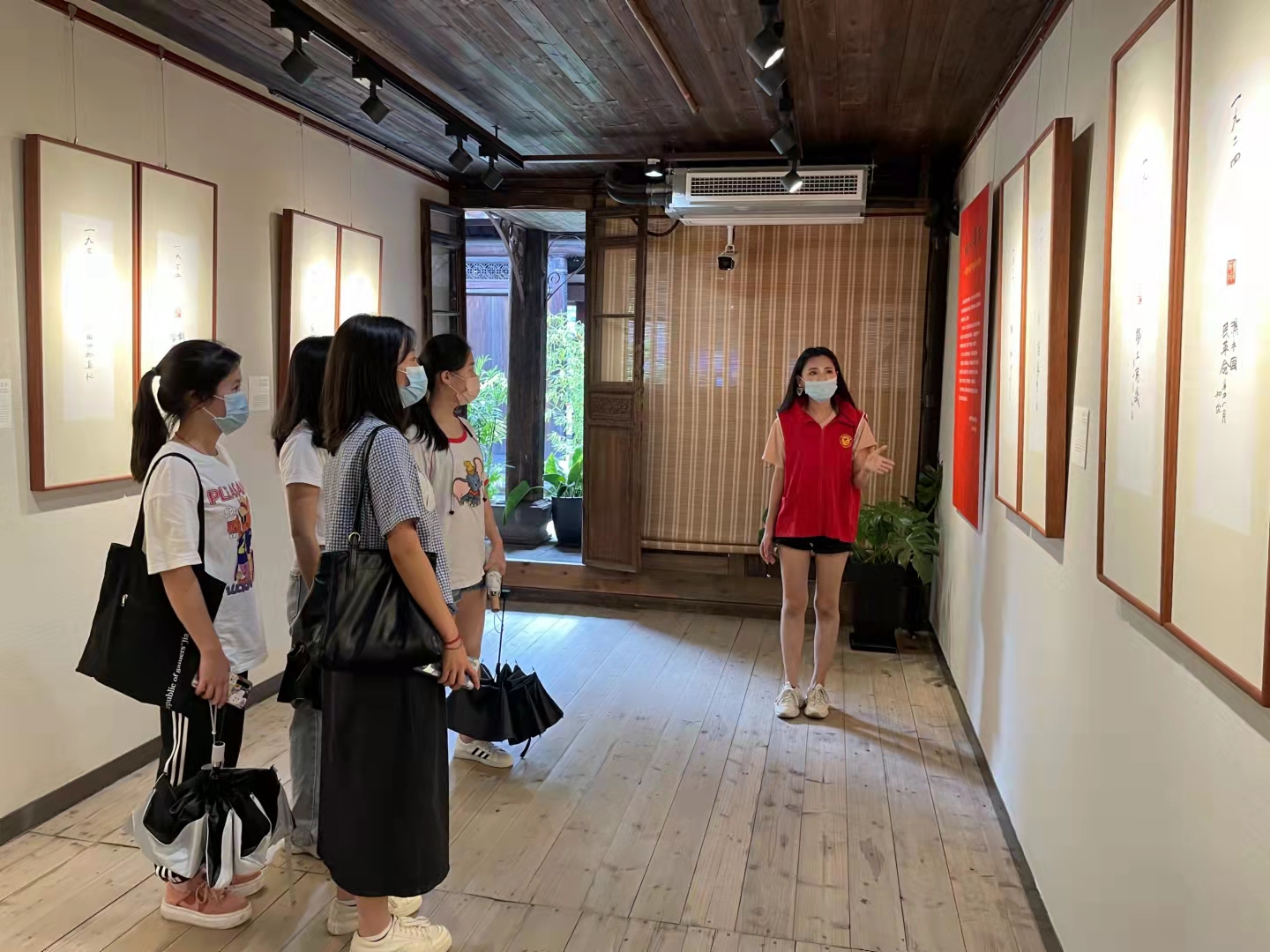 学生听展馆志愿者介绍篆刻艺术