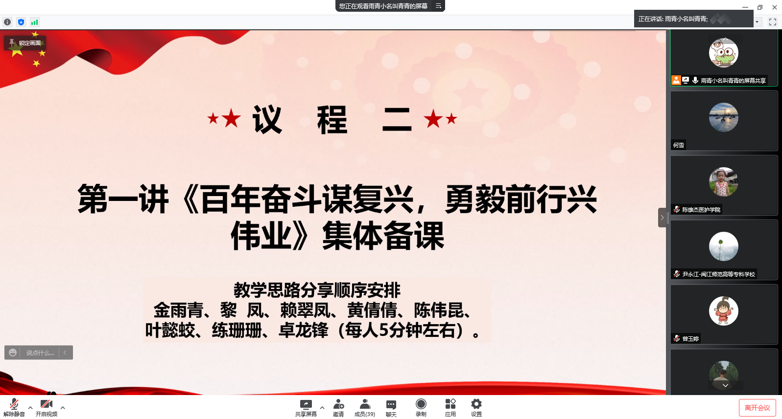 教研室副主任金雨青老师主持研讨活动。首先,她对新学期教研室工作进行部署,围绕教师队伍管理、课程课时安排、教学内容设计、集体备课、听课评课、课程资源库建设等方面提出新要求;接着,教研室开展集体备课研讨活动。金雨青、黎凤、赖翠凤、黄倩倩、陈伟昆、叶懿蛟、练栅栅、卓龙锋8位老师围绕第一讲“百年奋斗谋复兴,勇毅前行兴伟业”进行教学设计。整个研讨过程中,老师们密切结合学生专业特点,联系学校发展情况,结合冬奥会等时政热点充实案例和视频资源。通过研讨,参会老师进一步明确教学目标,突出重难点,丰富教学资源,拓展了教学思路。
