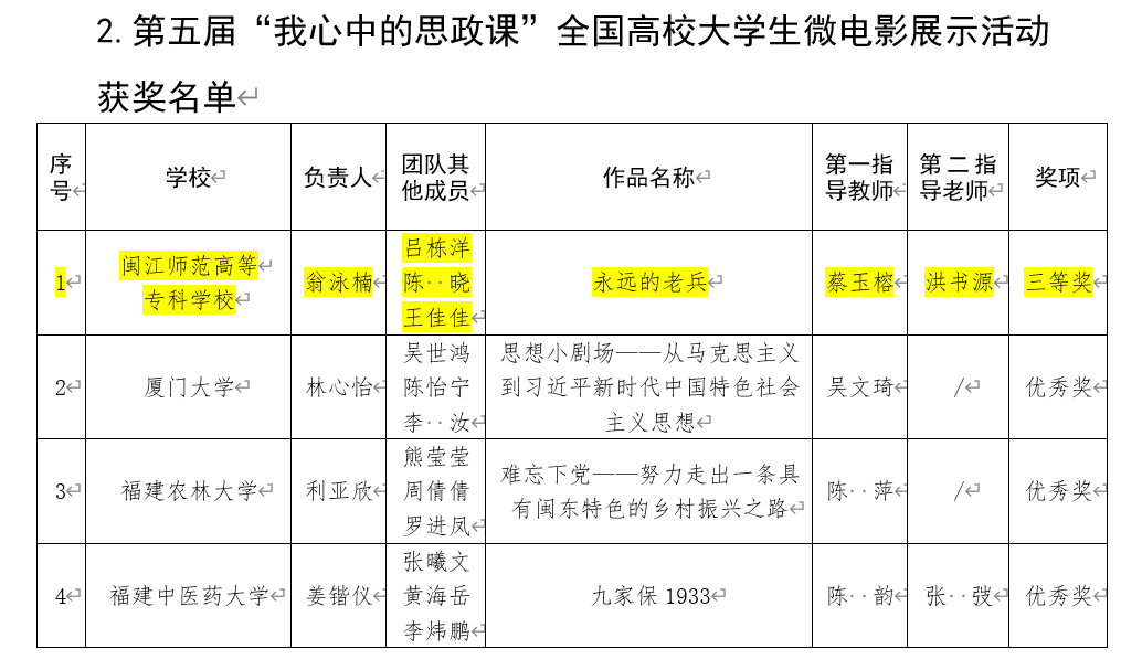 日前,中共福建省委教育工委《关于公布习近平新时代中国特色社会主义思想大学习领航计划系列主题活动获奖名单的通知》(闽委教思〔2022〕3号)下发,我院师生拍摄的微电影作品《永远的老兵》被省委教育工委选送参加全国微电影展示活动,荣获第五届“我心中的思政课”全国高校大学生微电影展示活动三等奖,这是福建省选送的十件作品中除优秀奖以外唯一获奖作品。同时,该奖项也是我校首次在该类别比赛中获得全国奖项。此外,在“马克思主义能够给予我们什么”第五届福建省高校大学生主题征文和微演讲活动中,我院选送的作品《传承的力量——从共产党宣言到我的宣言》荣获全省高职组一等奖。