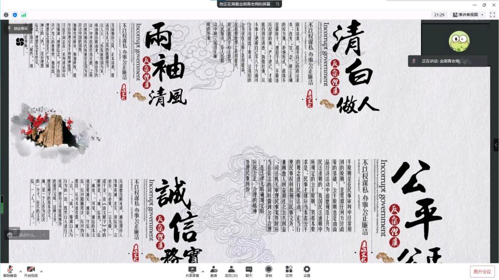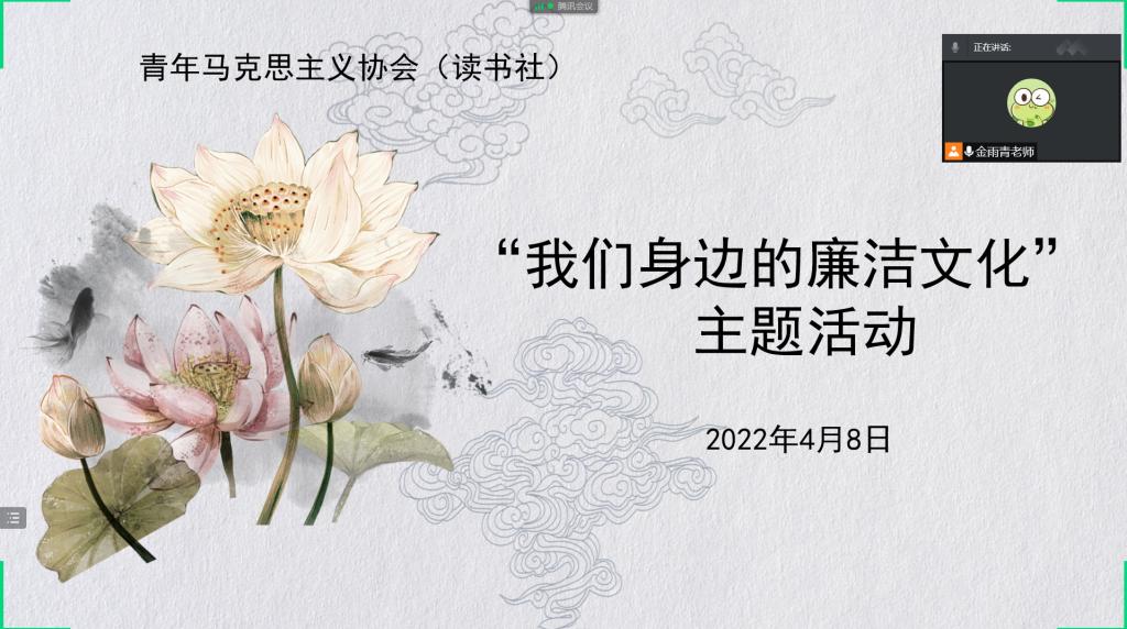 4月8日中午,青年马克思主义协会(读书社)在腾讯会议线上开展“我们身边的廉洁文化”主题活动,本次活动由指导老师金雨青主讲,读书社全体成员参与。