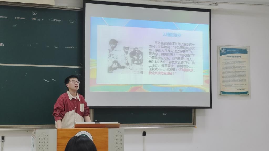 “先祭谷公,后拜祖宗”,林泽田老师首先用习近平总书记在中央党校县委书记研修班学员座谈会上的讲话引发同学们的思考与讨论;接着,林泽田老师详细介绍谷文昌这位优秀的中国共产党员,带领同学们走进他为人民群众奋斗奉献的一生。听闻谷文昌在东山县带领老百姓植树造林,把东山岛从风沙肆虐的“穷人岛”变成了粮食满仓的“宝岛”的事迹,同学们都为之动容。