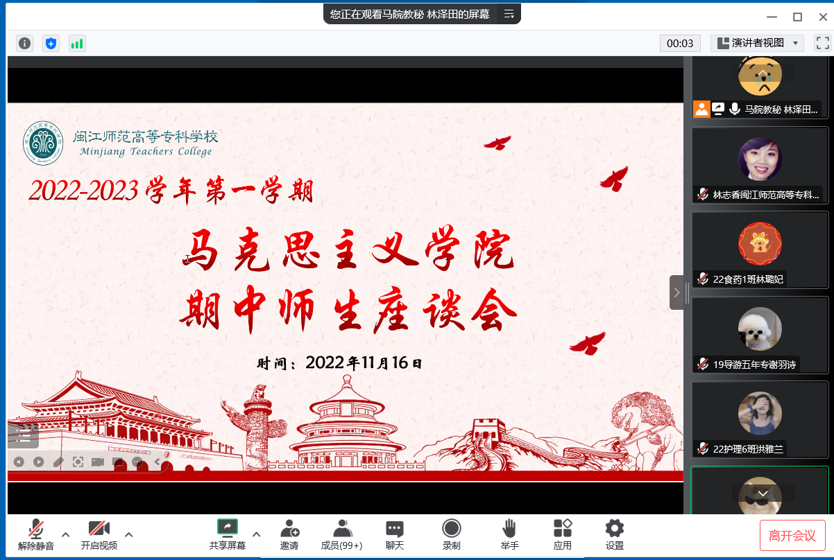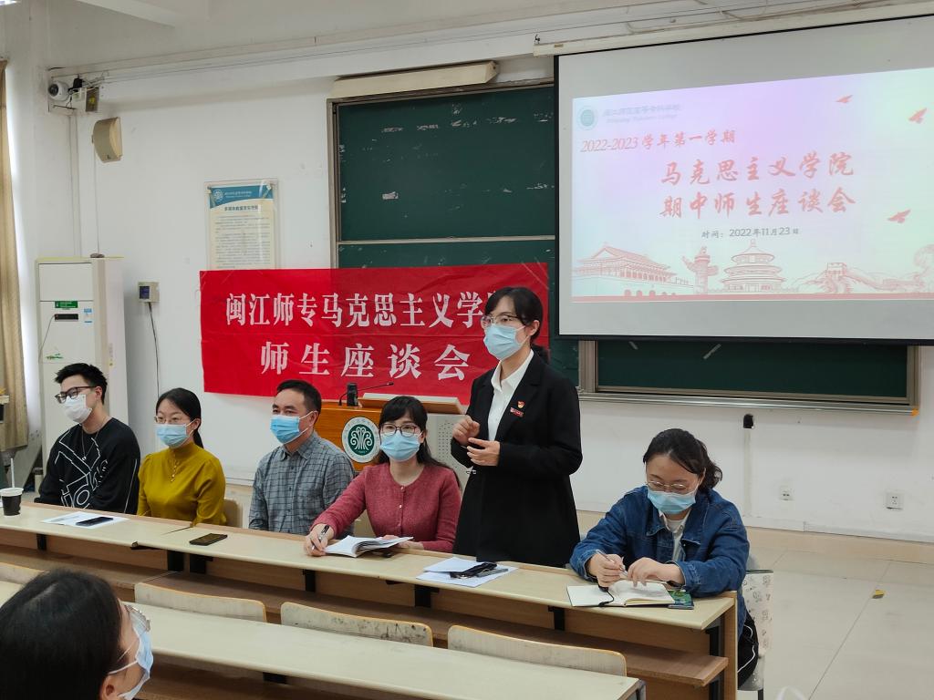 为扎实推进学院期中教学检查工作,倾听学生对思政课教学及管理的意见建议。11月16日和23日,学院教师在线上和旗山校区1014分别为三校区学生举办思政课教学情况师生座谈会,院长洪书源,副院长林志香,教研室主任穆亮红、张兆延、金雨青和教师代表魏志达出席,2021、2022级三年专和2019级五年专学生代表参加座谈会。座谈会由教学秘书林泽田主持。