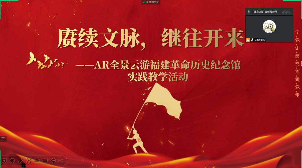 为更扎实推进党史学习教育常态化,引导广大青年学生知史爱党、知史爱国,11月22日中午,学生青年马克思主义协会(读书社)举办“赓续文脉,继往开来”线上实践教学活动,指导老师金雨青带领102位学生,线上AR全景云游福建革命历史纪念馆,反响热烈。