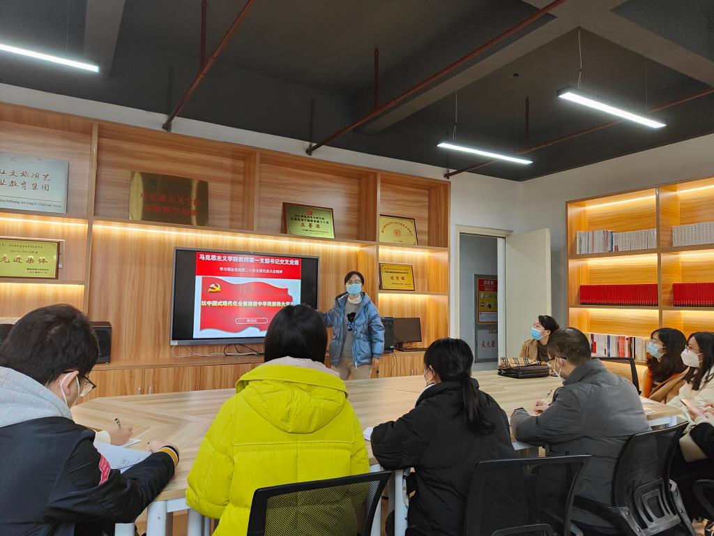 马克思主义学院教师第一支部(下称“第一支部”)书记穆亮红老师在“一马当先”学习室为第一支部和人事处(教师工作部)支部党员主讲“以中国式现代化全面推进中华民族伟大复兴”的主题党课。穆亮红老师围绕新时代中国特色社会主义怎么看、新时代中国特色社会主义怎么干、新时代党的建设新的伟大工程怎么建等问题,深入浅出地讲解马克思主义中国化的进程,明确了今后全党全国的工作方向和具体做法。她强调,空谈误国、实干兴邦,我们每一位教师要坚定信心,同心同德;埋头苦干,奋勇前进;为全面建设社会主义现代化国家、全面推进中华民族伟大复兴而团结奋斗。