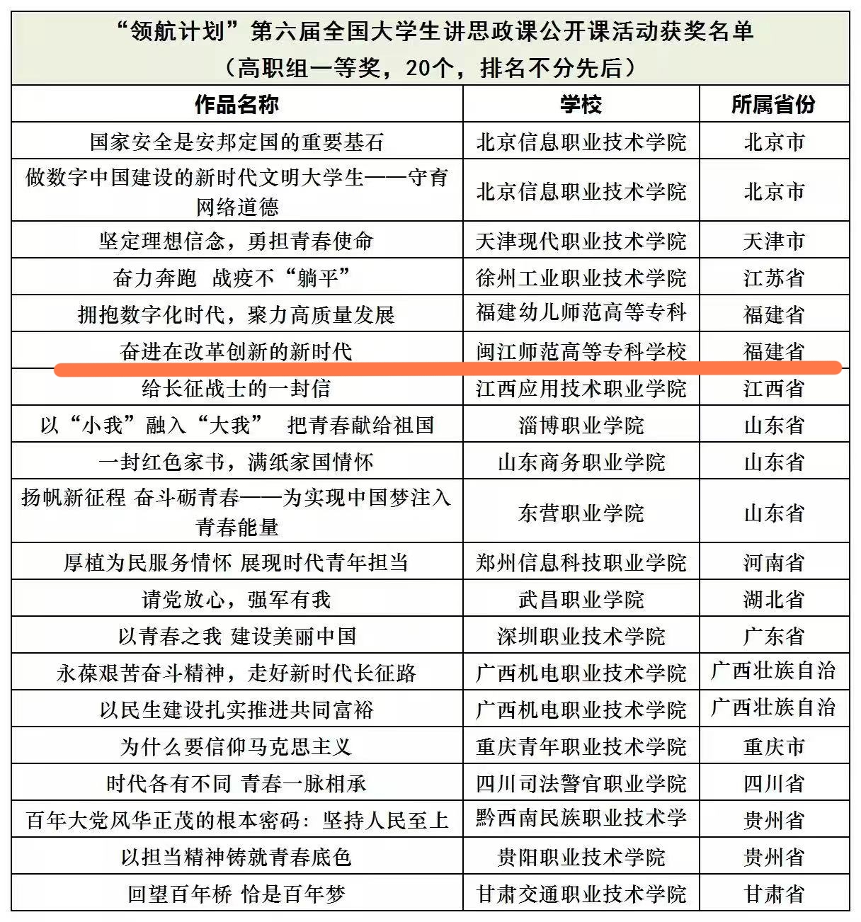 近日,由教育部高校思政课教学指导委员会主办的“领航计划”第六届全国大学生讲思政课公开课活动获奖名单公示出炉,我校马克思主义学院报送作品《奋进在改革创新的新时代》荣获高职组全国一等奖,福建仅两所高职院校获得该奖项。