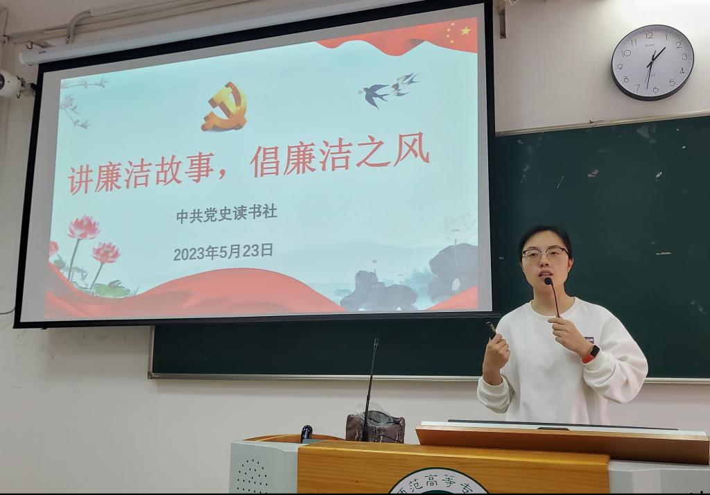 5月23日,在马克思主义学院党总支的组织下,我校中共党史读书社开展“讲廉洁故事,倡廉洁之风”为主题的故事分享活动。本次活动读书社全体成员参加,由穆亮红老师主持。本次活动师生共同分享了习近平与焦裕禄的廉洁故事,让同学们深刻认识到保持清正廉洁对党和大学生成长的重要性。通过此次活动,同学们认识到无论在多大的利益诱惑下,都应该坚定信念,保持节操,勤学修德,拒绝诱惑,努力成为新时代的青年榜样。