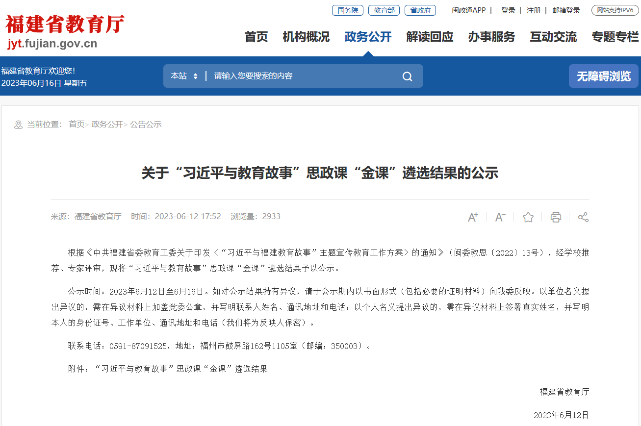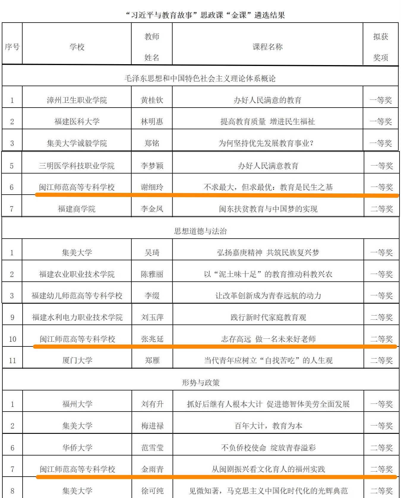 7月5日,由福建省教育工委主办的“习近平与教育故事”思政课“金课”遴选结果公布,我校马克思主义学院谢细玲老师《不求最大,但求最优:教育是民生之基》荣获一等奖,张兆延老师《志存高远 做一名未来好老师》、金雨青老师《从闽剧振兴看文化育人的福州实践》分别荣获二等奖。本次活动我校选送的三门课程全部获奖,在全省高职院校中成绩最优。