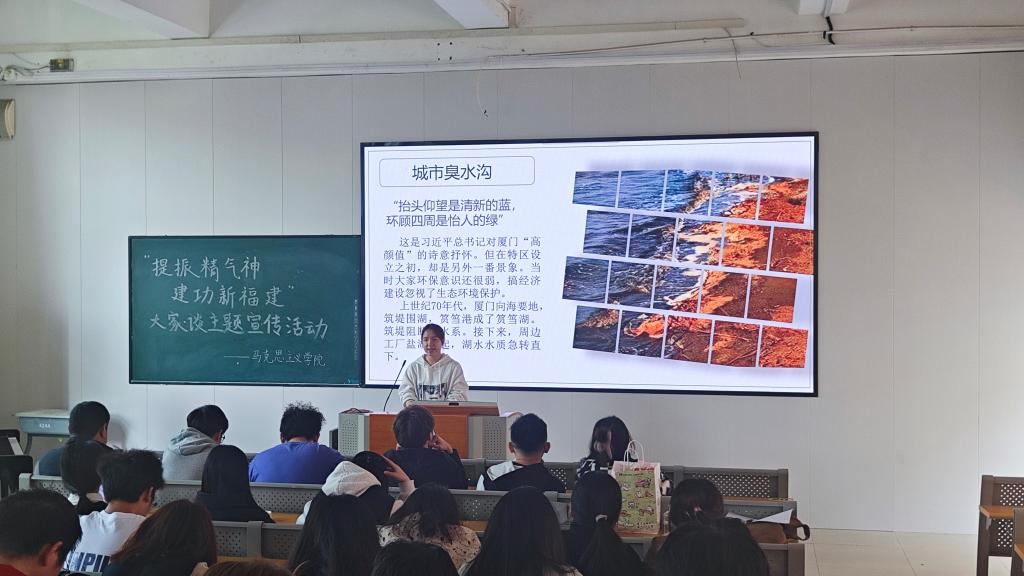 本次宣讲分为三部分,首先,汪育萍同学带领大家回顾苍霞新城社区的沧桑巨变,感悟习近平总书记深厚真挚的为民情怀和“马上就办”的工作作风。接着,邱嫣燃同学以筼筜湖前后的生态变化为线索,为同学们讲解了筼筜湖从“城市臭水沟”变成“城市会客厅”的治理过程。最后,陈印同学聚焦于自己家乡的变化,引出乡村振兴话题,呼吁新时代青年要践行知农爱农,投身乡村振兴。