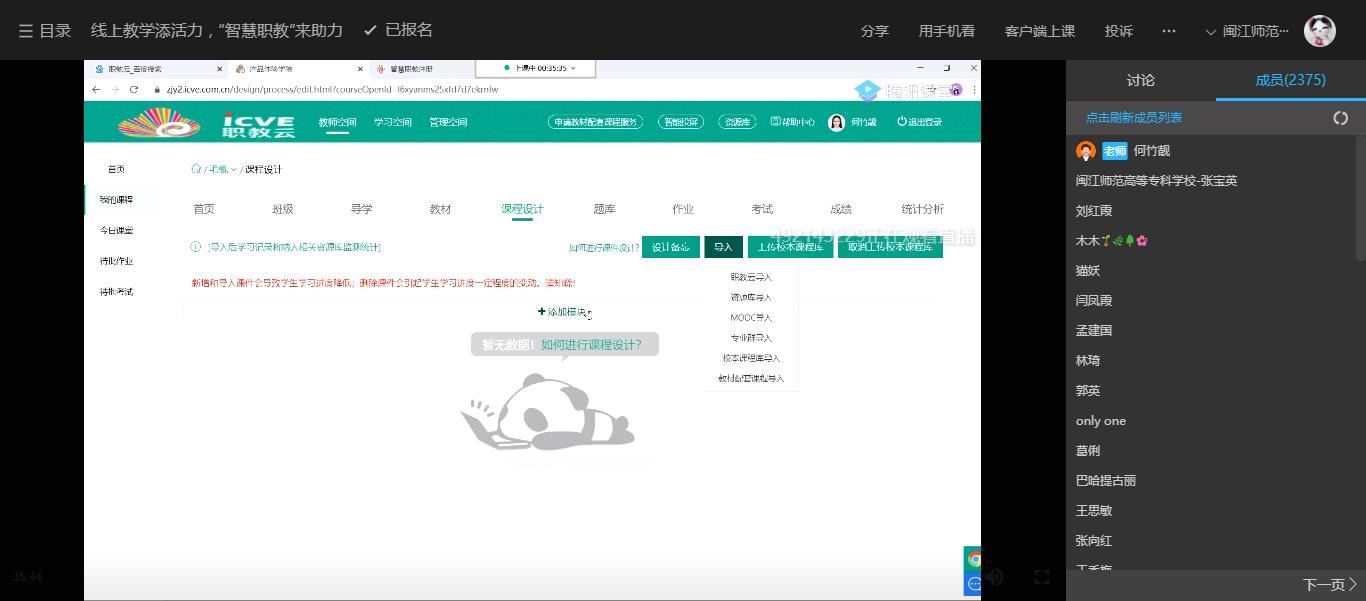 本次系列培训主要围绕职业教育在线开放课程在智慧职教如何搭建与应用;如何利用优质资源在智慧职教“职教云”平台上进行课程教学设计;如何利用“云课堂智慧职教”教学APP并结合直播工具开展线上教学互动;如何在平台支持下进行教学进程管控等方面进行介绍。鼓励与会教师积极运用现代信息技术手段,将课程“用起来、建起来、统起来”,打破传统教学模式,开展线上线下混合式教学改革,力争在课程建设、教师教学能力、教学质量工程等方面取得成果。