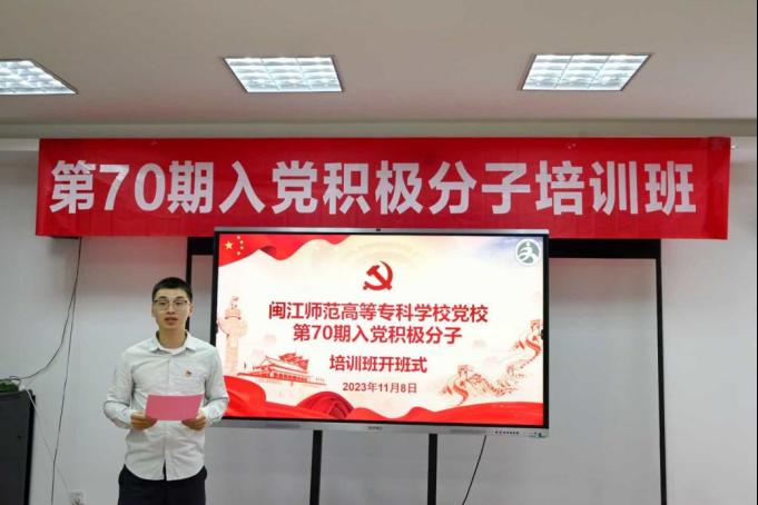 为推动学习贯彻习近平新时代中国特色社会主义思想主题教育走深走实,加强入党积极分子的教育培养,认真做好党员发展工作。11月8日,人文与管理学院于仓山校区3-103教室开展第70期入党积极分子培训班开班仪式。出席本次开班仪式的有人文与管理学院党总支副书记陈清芬、党总支组织委员游燕、学生党支部书记叶懿蛟、院团委书记黄益群、23级辅导员康书凌,以及第70期入党积极分子。