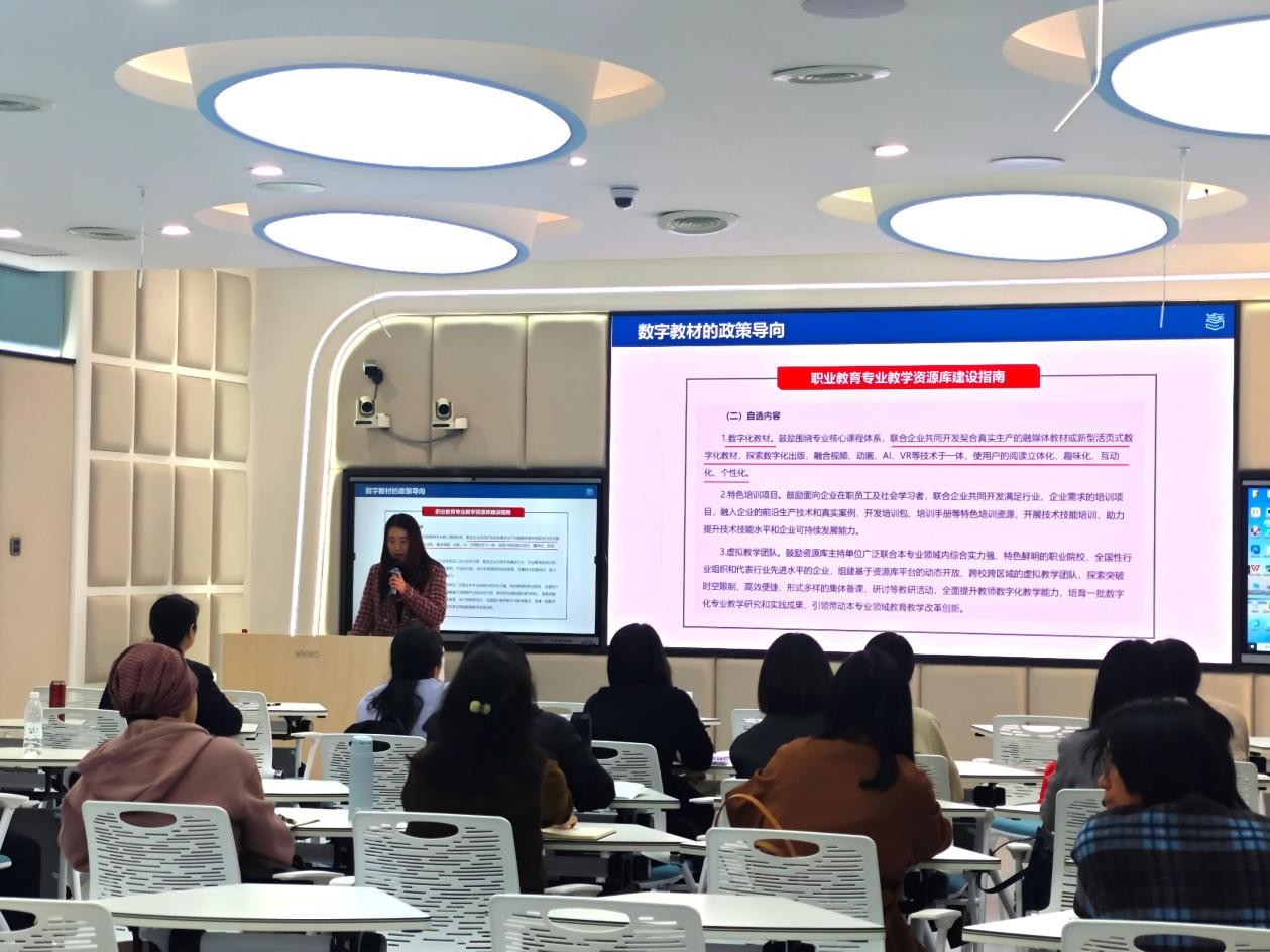 培训现场,许婷婷老师围绕AI优课的“备、教、练、测、评”全流程展开详细讲解。从AI辅助课件智能制作、数字人视频课件生成,到智能出题与学情分析,系统演示了如何利用AI工具大幅提升备课效率与课堂互动性。针对数字化教材建设,许老师结合中医药康养专业特色,深入剖析了内容架构设计、多模态资源嵌入(如3D模型、虚拟仿真场景)及知识图谱构建等关键环节,明确了校企协同开发、内容审核与动态更新的实操方法,为教师开展数字化资源建设提供了清晰的行动指南。过程中,参训教师全情投入,互动氛围热烈。