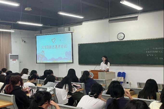 培训会上,学生党支部书记叶懿蛟老师就迎新的岗位职责、工作任务等具体事宜进行部署与安排,并强调迎新工作的重要性以及工作中的注意事项。随后,学院团委书记黄益群老师具体介绍各服务点志愿者分配人数情况,强调志愿者们要以热情高效、安全有序、协作互助共同落实好新生接待工作,树立人文形象,喜迎新生们的到来。最后,为帮助迎新志愿者更快地熟悉岗位职责,为23级新生们提供更优质的服务,院青年志愿者协会副会长郭雨瑶同学结合学院迎新路线方案及志愿者工作安排补充迎新流程中的细节。