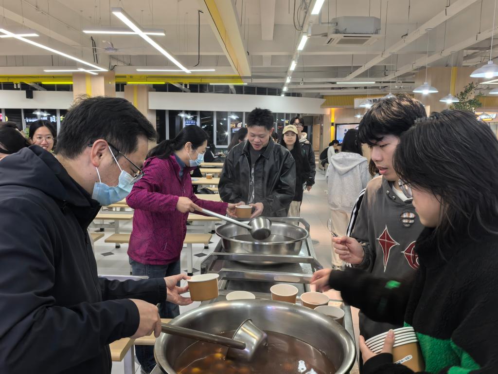 本次活动现场处处洋溢着温馨浓厚的节日氛围,由工作人员组织同学们进行自发分组、分工协作,揉面团、搓圆子等环节。同学们一同动手搓制汤圆,在揉面、塑形的互动过程中,与大家亲切交流校园生活点滴,传承中华优秀民俗文化,在欢声笑语中,一颗颗圆润的汤圆于水中翻滚,很快便煮出香甜的气息,学院党总支书记王海波老师结合冬至的民俗和文化内涵与同学们讲述冬至的传统寓意,学院院长陈勤老师也深入学生之间与他们一同感受节日的氛围,工作人员将煮好的汤圆逐碗盛好,递到每个人手中。热气腾腾的汤圆上桌后,同学们围坐在一起品尝美食,有人分享家乡的冬至习俗,有人畅谈学习生活的收获与感悟,温暖的氛围驱散了冬日的寒意,尽显师生同乐、校园团圆的美好画面。