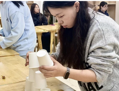 “纸杯叠叠乐”游戏将活动推向高潮,成员们不仅要保持手眼协调,更需在短时间内默契配合,确保纸杯金字塔稳固不倒,团队协作能力在实践中得到显著提升。