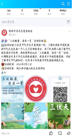 在本次活动中,首先由活动工作人员在线上群介绍活动开展的背景意义和活动内容,从而加深参与者对活动的进一步了解,然后由参与者在空间发布三伏天节气的相关习俗并配上活动海报以此完成活动。通过对三伏天节气习俗的学习,师生们对三伏天节气的简要内容、伏天日期的计算和时间、相关的饮食调理和防暑常识都有了深刻的认识,同时也从中解读到二十四节气凝聚的民族智慧和蕴含的深厚文化寓意,更是看到这一非物质文化遗产的丰富内容,它不仅包括了相关的谚语、歌谣、传说等,还有传统的生产工具、生活器具、工艺品、书画等艺术品,以及与此相关的节日文化、生产仪式和民间风俗等,让忙碌的现代人在繁忙节奏中感受到了生活的气息和仪式感。